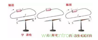 上圖展示了電流的磁效應(yīng),導(dǎo)線通電之后,周圍產(chǎn)生的磁場使磁針發(fā)生了偏轉(zhuǎn)。