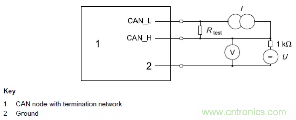 一個(gè)CAN節(jié)點(diǎn)集成電路協(xié)議設(shè)置為總線空閑時(shí),可檢測到的隱性位輸入限值應(yīng)通過圖 1的電路測量。其中I的值是指可以產(chǎn)生使節(jié)點(diǎn)在隱性狀態(tài)下檢測到隱性位的最大差分輸入電壓的電流值。電壓源U的電壓為: