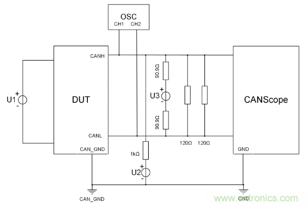斷開電壓源U3,調(diào)節(jié)電壓源U2,逐步將共模電壓調(diào)到6.5V或-2V,在此期間DUT應(yīng)能正常發(fā)送報(bào)文;