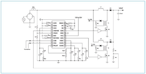 圖 3 顯示了業(yè)界首款單芯雙相交錯(cuò)式 PFC 預(yù)調(diào)節(jié)器——TI UCC28070 的簡化原理圖。交錯(cuò)雙相相互之間的相位差為 180°,這樣則消除了波紋電流,從而可以使用更小的電磁干擾 (EMI) 濾波器以及外觀更小巧的 PFC 輸出電容器。雙相交錯(cuò)式拓?fù)浣Y(jié)構(gòu)、體積更小的元件是嵌入式馬達(dá)驅(qū)動(dòng)電路的理想解決方案。交錯(cuò)式 PFC 可滿足非常高的功率密度要求。