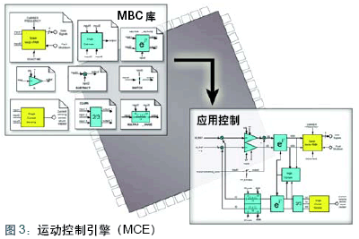 無傳感器磁場定向控制算法能夠以全新的控制器體系結構實現。圖2中所示控制系統的每個功能都可以用硬件宏模塊實現,而不是軟件。諸如比例積分控制、矢量旋轉和Clarke變換等功能可共用于所有交流電機控制系統。如圖3所示,運動控制引擎(Motion Control Engine)庫中包含交流電機控制模塊和其它通用模塊。獲取電機控制芯片,就能夠取得MCE庫,以及模擬輸入和空間矢量PWM控制等功能。開發人員可以使用圖形工具將元件從MCE庫拖入自己的控制系統設計,然后利用圖形編譯器將控制設計翻譯為MCE序列指令,以正確順序連接硬件宏模塊從而實現自己的控制系統。該方法可以不必在開發過程中進行軟件編碼,既能節省時間,又能減少錯誤。