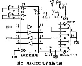 系統(tǒng)產(chǎn)生的信號需要經(jīng)過電平變換,轉(zhuǎn)換成RS-232電平,與計(jì)算機(jī)通信。這里采用MAX3232為核心電平變換電路。其原理圖如圖2所示。