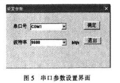 要實(shí)現(xiàn)計(jì)算機(jī)串行通信的功能,一種較為簡便的方法是使用MSComm(Microsoft Communication Control)通信控件,它提供了標(biāo)準(zhǔn)的事件處理函數(shù)過程,是微軟公司開發(fā)的專門用于串行通信的控件。它是高級語言編寫的串行通信程序和PC串口之間的橋粱。本系統(tǒng)采用得就是這種方法。設(shè)置控件的屬性。添加控件的響應(yīng)代碼。就可以使串口按照要求進(jìn)行工作。在這個(gè)界面,可以進(jìn)行串口號和波特率的設(shè)置。通信參效設(shè)置界面如圖5所示。