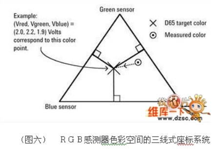 基本上來說,三色光感測(cè)器會(huì)產(chǎn)生一個(gè)三維色彩規(guī)格系統(tǒng),因此稱為RGB感測(cè)器色彩空間,這個(gè)系統(tǒng)可以讓特定色彩由感測(cè)器的輸出電壓來指定,例如具備特定亮度的D65白光可以記錄為:(Vred, Vgreen, Vblue)=(2.0, 2.2, 1.9)volts。