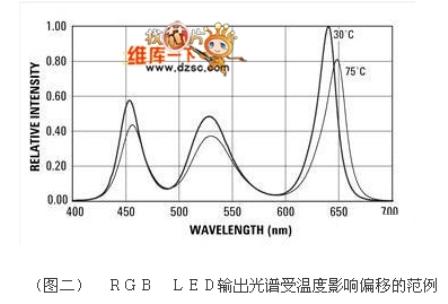 這類LED光源的簡(jiǎn)單開迴路架構(gòu)方式有個(gè)潛在的問題,由于LED的光學(xué)特性會(huì)受到運(yùn)作條件的影響,因此組合后的RGB光源輸出的亮度以及色度都會(huì)變化。同時(shí),每顆LED元件也不盡相同,因此造成RGB光源的輸出產(chǎn)生更多變化,(圖二)與(圖三)就描述了幾個(gè)LED變動(dòng)的范例。