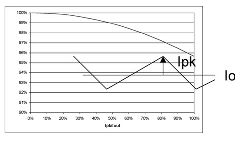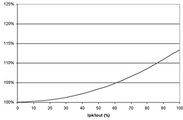 圖4 也闡明了即使在紋波電流較大的時候,對功耗也沒有重大影響。例如,50%的紋波電流僅增加不足5%的功率損耗。當(dāng)大大超過此水平時,需要減小電源的DC電流以保持結(jié)溫不變,從而維持半導(dǎo)體的使用壽命。經(jīng)驗(yàn)法則顯示,結(jié)溫每降低10%,半導(dǎo)體使用壽命就會延長兩倍。并且,許多設(shè)計(jì)都傾向于更小的紋波電流,這是因?yàn)殡姼衅鞯南拗啤=^大多數(shù)電感的設(shè)計(jì)處理能力小于20%的Ipk/Iout紋波電流比率。