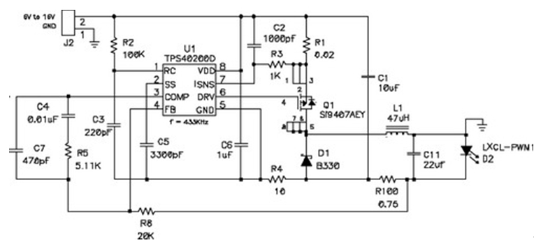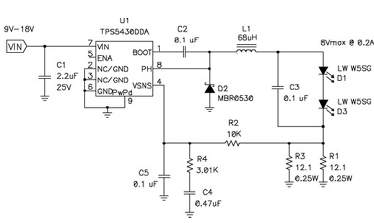 在輸出電壓始終小于輸入電壓的情況下,應(yīng)使用降壓穩(wěn)壓器,圖5顯示了該拓?fù)浣Y(jié)構(gòu)。在該電路中,對電源開關(guān)的占空比 (duty factor) 進(jìn)行了控制,以在輸出濾波器電感 L1 上確立平均電壓。當(dāng)FET開關(guān)閉合時(TPS5430 內(nèi)部),其將輸入電壓連接到電感器,并在L1中構(gòu)建電流。D2為環(huán)流二極管 (catch diode),可提供開關(guān)斷開時的電流路徑。電感器可對流過LED的電流起到平滑的作用,該工作可通過用電阻監(jiān)控(測量)LED電流,并將電壓與控制芯片內(nèi)部的參考電壓進(jìn)行比較,最終進(jìn)行調(diào)節(jié)。如果電流太低,則占空比增加,平均電壓也上升,從而也導(dǎo)致了電流的升高。該電路具有極佳的效率,因?yàn)殡娫撮_關(guān)、環(huán)流二極管以及電流感測電阻上的壓降非常低。