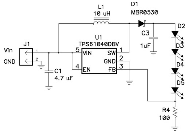 當(dāng)輸出電壓總是比輸入電壓大時,最好采用升壓轉(zhuǎn)換電路,如圖6所示。該電路的U1有一個帶有控制電子器件的高度集成的電源開關(guān)。當(dāng)開關(guān)閉合時,電流流過電感器到接地。當(dāng)開關(guān)斷開時,U1的引腳 1 電壓會升高,直到D1導(dǎo)通。然后電感器放電,電流進(jìn)入輸出電容器(C3)和LED串。在絕大多數(shù)應(yīng)用中,C3通常用于平滑LED電流。如果沒有C3,則 LED電流將是斷斷續(xù)續(xù)的。也就是說,它會在零和電感電流之間切換,這會導(dǎo)致 LED 熱量增加(從而縮短使用壽命),亮度減少。在前面的例子中,LED 的電流是通過一個電阻感測的,并且占空比會發(fā)生相應(yīng)的變化。請注意,本拓?fù)浯嬖谝粋€嚴(yán)重的問題,即它沒有短路保護(hù)電路。若輸出短路,則會有較大的電流通過電感器和二極管,從而導(dǎo)致電路失效,或者輸入電壓崩潰。