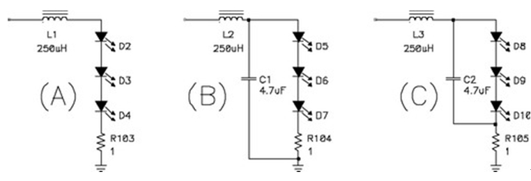 關(guān)閉 LED 電源上的電流環(huán)路比關(guān)閉傳統(tǒng)電源上的電壓環(huán)路簡單。環(huán)路的復(fù)雜性取決于輸出濾波器的配置。圖8顯示了三種可能的配置:只有一個簡單電感器的濾波器(A);一個典型的電源濾波器(B);以及一個修正后的濾波器(C)。