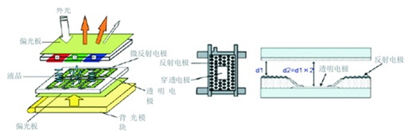 半穿透型高畫質全彩液晶顯示器的反射電極部位光線穿透率會降低,其結果造成背光照明模塊的畫面輝度降低,不過外部光線一旦變亮,利用外部光線的射入,反射電極部位的輝度會提升,因此半穿透型液晶顯示器在任何外部光線環境下,都可以維持一定的畫面識別性。