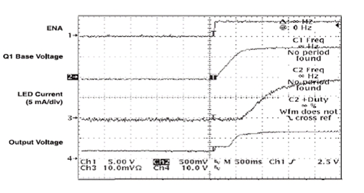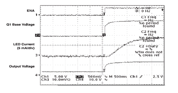 應用使能信號 (enable signal) 時,R3 將慢慢給 C3 充電,此舉會慢慢開啟 Q1。TPS61040 會通過 D2 被立即啟用。在電路閉合時,FB 到接地的初始電阻極高,從而將 LED">LED 電流限制為 0 mA。隨著 Q1 慢慢開啟,有效電阻逐漸下降,電阻的下降與 LED">LED 電流的升高有直接的關系。LED">LED 從亮度為 0% 變為 100% 的亮度,需時 1 到 2 秒鐘,具體的時間長短取決于選定的時間常數。圖 3 顯示了電路閉合時的相關波形。