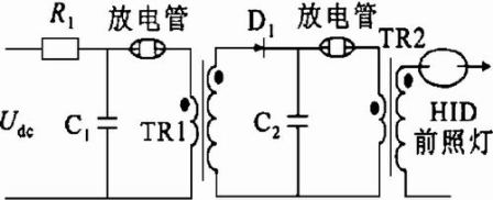 啟動期間,電子鎮流器要經歷高壓擊穿、電流接續、預熱維弧3個階段。高壓啟動電路是HID 前照燈能否瞬間點亮的基礎。但輝光放電后慣性和濾波延遲使直流變換器和檢測回路很難有較快的響應速度,所以需要如圖1所示的電流接續(take-over) 電路,它可利用電容預先儲存的能量為燈提供一個較大的瞬間電流(約300ms) ,保證輝弧可靠過渡。一般高壓發生電路有以下幾種: