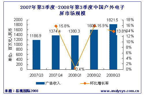 據(jù)易觀國際最新報告《2008年第3季度中國戶外電子屏廣告市場季度監(jiān)測》研究結(jié)果顯示:2008年第3季度戶外電子屏廣告市場收入規(guī)模為18.21億,環(huán)比增長13.8%,同比增長53.5%。