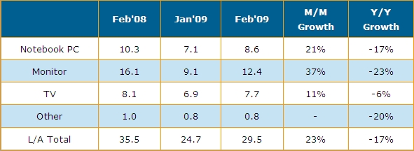 • 二月份的出貨表現(xiàn)對(duì)于面板廠可說(shuō)是一大鼓舞,并且反映了市場(chǎng)的需求回籠