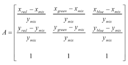 為您的系統(tǒng)設(shè)計(jì)LED控制機(jī)制,面對的是基本的線性代數(shù)。在得到您LED的色度坐標(biāo)后,您必須先建立一個(gè)矩陣,找出所要色彩點(diǎn)之間的delta值,如公式1所示。公式中色彩下標(biāo)字是LED的顏色,mix下標(biāo)代表您想要呈現(xiàn)的顏色。