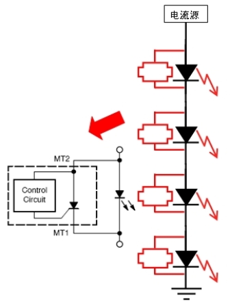 圖5:安森美半導(dǎo)體NUD4700 LED開(kāi)路分流保護(hù)器的應(yīng)用示意圖