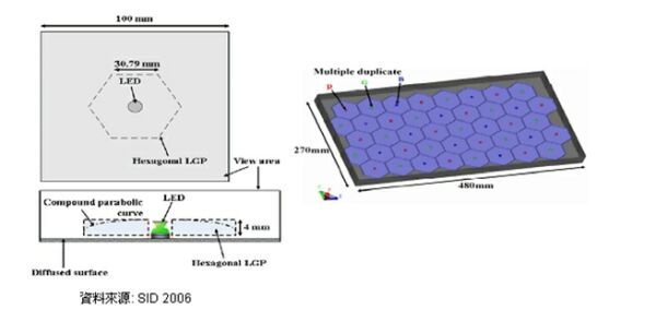 在2006年SID會議上,臺灣交通大學提出了一種整體上是直下式,而單個來看卻是采用側射式的LED,從而提高了其光線利用率,減少了所需LED數目并提高了效率。這種技術主要是采用側射式LED搭配以六角形導光單元.