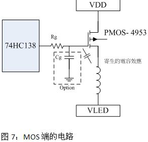 掃描屏上;建議在MOS的Gate端與74HC138之間串一個(gè)電阻,以避免VLED端的電感效應(yīng)及MOS端寄生電容所產(chǎn)生的突波,造成74HC138燒毀;建議Rg<100Ω、Cg<47pF(電容部份可選擇不加)。