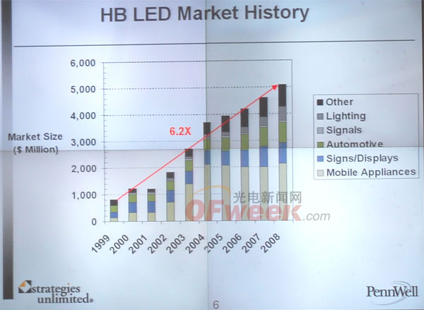2009年LED持續(xù)擴大其在niche和通用照明領域的滲透率,2008年增長55%,2009年由于受經濟衰退的影響估計將增長15%。