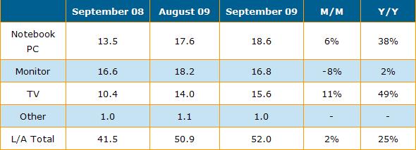 表一: 9月份大尺寸面板按應(yīng)用別出貨量與成長率(單位:百萬片)