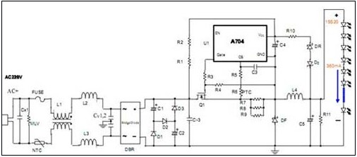 非隔離的使用的LED日光燈電源,以臺灣廣鵬科技公司的A704WFT為例,A704WFT的MOS管外掛,其基本線路如圖1所示: