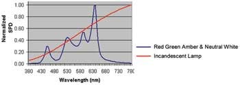 多通道驅動器:就給定的色溫而言,高質量CRI(90以上)會需要多種類型的LED。CRI是光源的光譜能量分布(SPD)的一個函數(shù)。SPD是指給定波長(頻率)下光源的輻射量。CRI數(shù)值表現(xiàn)最好(97以上)的白熾燈工作壽命較短(750~2500小時),效率也較低(美國能源部的數(shù)據(jù)為10~17Lm/W)。圖2顯示了白熾燈的SPD曲線與RGB光源曲線的對比情況。