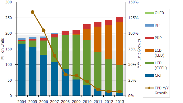圖一:2004-2013全球電視市場按不同技術(shù)出貨量與平面電視年成長率(單位:百萬臺(tái))