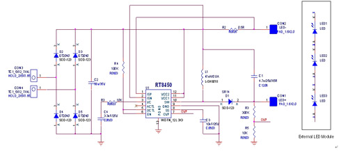 圖2:基于5WMR16LED燈與RT8450的驅(qū)動器電路板