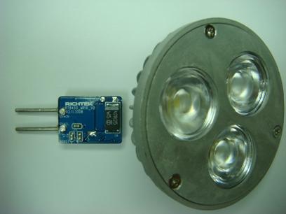 此外RT8450采用了非常小的WDFN封裝并具有4.5-40V輸入電壓范圍,這使得RT8450的驅(qū)動電路能提供很寬的驅(qū)動電壓范圍及輸入保護。RT8450的工作溫度高達125℃,可以在MR16燈具內(nèi)的高溫環(huán)境中安全地工作。其500kHz的開關頻率使驅(qū)動電路可以采用小尺寸的電感和電容,另外升降壓電路架構可以將輸入濾波電容容值降低,這樣便可以將驅(qū)動電路放置在MR16燈具中,如圖2所示。