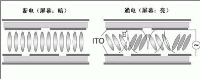 所以IPS的驅動電壓會較高,一般需要15伏。由於電極在同一平面會使開口率降低,減少透光率,所以IPS應用在LCDTV上會需要更多的背光燈如圖,細條型的正負電極間隔排列在基板上,有些類似早期的VA模式液晶。把電壓加到電極上,原來平行於電極的液晶分子會旋轉到與電極垂直的方向,但液晶分子長軸仍然平行於基板,控制該電壓的大小就把液晶分子旋轉到需要的角度,配合偏振片就可以調制極化光。