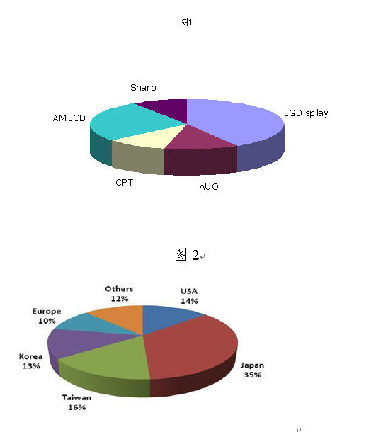 數(shù)據(jù)顯示,國內(nèi)所有的LED TV面板來源全部進(jìn)口,其中有部分open cell的模式,但是背光模組仍是采用指定購買的方式。從中國大陸地區(qū)LED面板供應(yīng)來源來看,以2010年第一季度為例,主要供貨來源為LG Display, AMLCD, AUO, CPT(如圖1),其中CPT供貨多數(shù)為小尺寸。而從全球LED面板產(chǎn)值來看,日本廠商目前為市場領(lǐng)導(dǎo)者,臺灣和韓國廠商積極擴(kuò)大產(chǎn)值(如圖2)。由此來看,LED TV面板產(chǎn)業(yè)市場集中度非常高,未來的LED TV市場的競爭格局主要受限于廠商的資源分配情況。