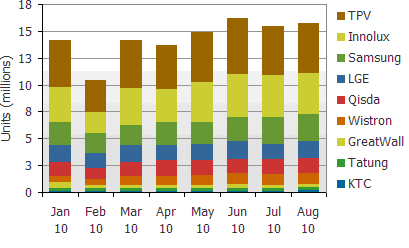 圖二: 2010年1月到8月全球前九大液晶顯示器代工廠生產(chǎn)計(jì)劃