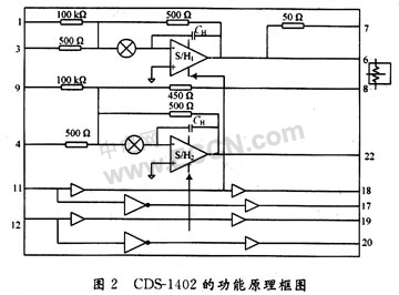 在CCD的應(yīng)用領(lǐng)域中。相關(guān)雙采樣電路得到了廣泛的應(yīng)用。很多公司專門研發(fā)了相關(guān)雙采樣的集成電路芯片。這些專用芯片不僅使用方便,且性能也能得到很大的提高。CDS1402芯片是一種典型的相關(guān)雙采樣電路芯片,它是專門為CCD成像器件研制的,用來消除復(fù)位噪聲。CDS1402進(jìn)行了優(yōu)化,適合用于10~14位轉(zhuǎn)換精度的數(shù)字視頻。低噪聲的CDS1402芯片也是利用對(duì)高低電平信號(hào)的采樣并相減來精確確定視屏信號(hào)的。結(jié)果在CCD輸出的浮動(dòng)電容器上,那些剩余電荷和kTC噪聲被最大限度的消除。CDS1402芯片一共有24個(gè)引腳。它包含有2個(gè)獨(dú)立的采樣保持放大器和S/H電路,每個(gè)S/H電路都有獨(dú)立的控制線,輸人和輸出管腳,有兩個(gè)管腳提供偏置調(diào)流和調(diào)壓。一般來說,CCD的輸出信號(hào)都要連接到2個(gè)S/H的輸入端,S/H1端用來采集和保持偏置信號(hào),它的輸出值與CCD輸出信號(hào)相減,當(dāng)CCD輸出偏置+視頻信號(hào)的時(shí)候,S/H2端就進(jìn)入信號(hào)的采集狀態(tài),從而獲得有用的視頻信號(hào)。