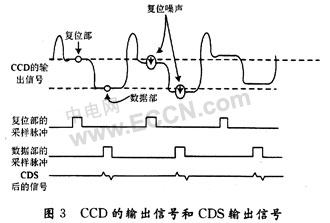 從圖3可以看出,當(dāng)復(fù)位部脈沖是高電平的時(shí)候。CCD的輸出信號(hào)進(jìn)行第1次采樣,采樣信號(hào)為復(fù)位電壓、復(fù)位失調(diào)電壓和復(fù)位噪聲;當(dāng)數(shù)據(jù)部脈沖是高電平時(shí),CCD的輸出信號(hào)進(jìn)行第2次采樣,采樣信號(hào)除包括復(fù)位電壓、復(fù)位失調(diào)電壓和復(fù)位噪聲外,還包括有用的視頻信號(hào)。