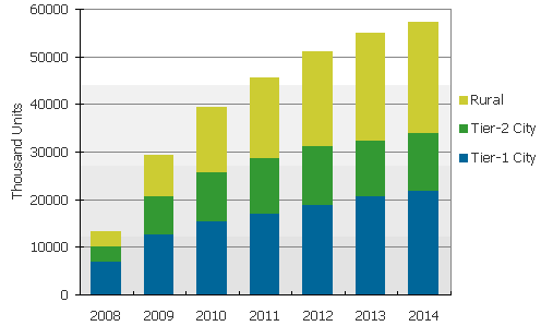圖一 2008年到2014年中國液晶電視在不同區(qū)域的發(fā)展?fàn)顩r