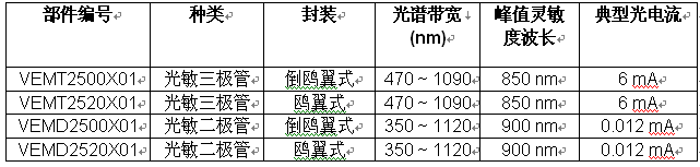 光敏二極管的光電流為12µA,光譜感光范圍為350nm~1120nm,光敏三極管的光電流為6mA,光譜感光范圍470nm~1090nm。VEMD25x0X01和VEMT25x0X01器件的暗電流為1nA,半感光角為±15°,溫度范圍為-40℃~+100℃,可搭配高亮度、高速VSMB20x0X01中的紅外發射器。