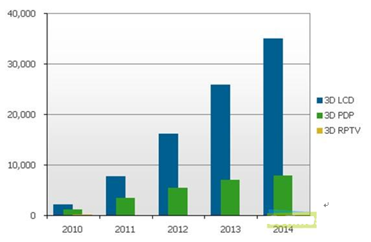 圖一:2010-2014 3D電視按不同應(yīng)用技術(shù)出貨量預(yù)測(單位:千臺)