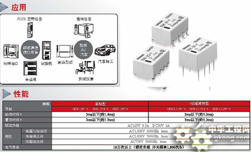 同樣,在精密電子元器件領域具有世界級技術實力的歐姆龍,利用其獨特的傳感與控制技術持續實現了繼電器、開關、轉接器等電子產品的小型化、高性能和節能特性,也必將為西部高端電子元器件應用帶來更多新選擇。歐姆龍電子部件的展品包括:FPC連接器、IDC連接器等(應用領域從移動設備到產業機器);高可靠性的繼電器,可用于通信基礎設施、數碼家電、加工機床等設備;還有可應用于產業設備、家電、車載、娛樂相關設備等各種領域的開關產品。最近,該公司高5.2mm×寬6.5mm×長10mm的超小型表面安裝繼電器G6K-Y系列在中國實現了量產。這種繼電器號稱具有世界最小級別的封裝面積與高度,適用于高密度封裝,并實現最低功耗100mW。