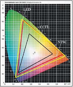 這樣,每個LED都共用相同的I-LED峰值電流,而且需要額外的電子電路來對每個LED的亮度進行獨立控制。這種功能通過為每個LED使用獨立的PWM調制來實現(見圖4):由數字信號PWM1至PWM3控制的開關S6~S8啟動/關閉相關的電流鏡,因此產生相關LED的亮度控制。其凈優勢是LED峰值電流恒定,確保了色彩表現不會被亮度控制所減弱,LED的工作點保持在色彩地圖所定義的參考色彩,見圖5。