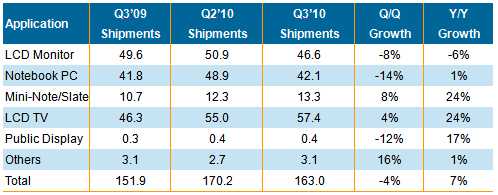 超過9.1寸的大尺寸TFT LCD的出貨量在2010年第三季降到1億6千3百萬片,較前季下降4%,但與去年同期相比則呈現(xiàn)7%的成長(zhǎng)。營(yíng)收數(shù)字達(dá)到美金213億元,較前季下滑7%,但與去年同期相比則成長(zhǎng)了7% 。根據(jù)最新出版的Quarterly Large Area TFT LCD Shipment Report 指出,當(dāng)產(chǎn)能利用率因?yàn)榻K端市場(chǎng)需求減緩和供應(yīng)鏈上各廠商自身的存貨調(diào)整能夠控制在適當(dāng)?shù)姆秶H,面板業(yè)者將2010年第四季的出貨成長(zhǎng)目標(biāo)定為3% 的成長(zhǎng)率。