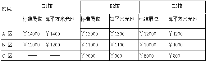 (A) 標(biāo)準(zhǔn)展位(每個(gè)標(biāo)準(zhǔn)展位為3米×3米=9平方米) 標(biāo)準(zhǔn)展位設(shè)施配備為:三面鋁合金圍板、滿鋪地毯、兩只射燈、兩把折椅,一張問詢桌和一個(gè)220V/500W的電源插座,楣板上書中英文公司名稱。單個(gè)拐角位置展位費(fèi)增加10%