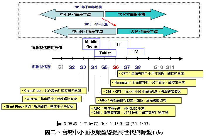 2011年是中小尺寸面板產(chǎn)線的轉(zhuǎn)型之重要年度,由于面板廠朝向更高世代生產(chǎn)大尺寸液晶面板更具有規(guī)模效益,故目前電視用面板主流切割世代廠走向7~8代,進而開啟6代以下開始大量生產(chǎn)中小尺寸面板逐漸成為主流。同時,走向觸控面板的生產(chǎn)制造結(jié)合,亦成為共同走向。