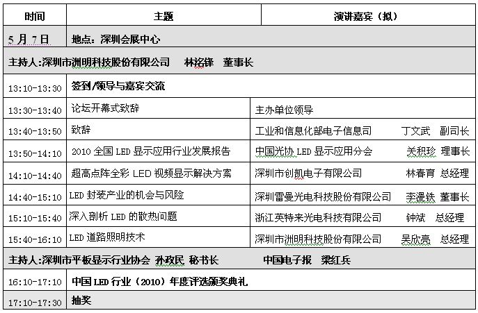 1.講座 主辦方將邀請(qǐng)國內(nèi)知名LED行業(yè)專家分析2010年中國LED產(chǎn)業(yè)發(fā)展問題、2011年中國LED企業(yè)的總戰(zhàn)略及調(diào)整方向,預(yù)測中國LED市場各領(lǐng)域(原材料、設(shè)備、外延芯片、顯示屏、照明等)的投資情況分析及趨勢(shì)。