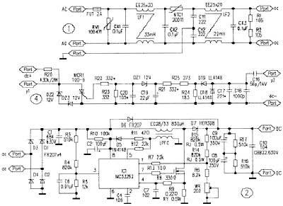 MC33262是一款可靠且成本低廉的功率因數校正芯片,其應用電路如圖2所示。市電經電源濾波器和整流器得到脈動直流電。電流通過啟動電阻R10向C2充電至10V時,IC1開始工作。整流后的直流脈動電壓在R5的分壓作為取樣信號經IC1的③腳輸入乘法器。直流輸出電壓在R6和WR上的分壓經①腳輸至誤差放大器的反相輸入端,與2.5V的參考電壓比較放大后輸出一個直流誤差電壓,同時也輸入到乘法器。