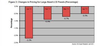 據IHS iSuppli公司的研究,4月份大尺寸液晶面板的價格降幅預計小于1%,日本地震與海嘯對其影響顯然不大。