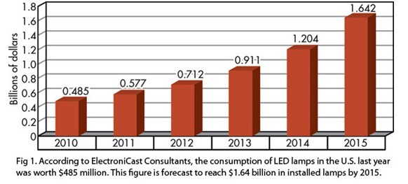 ElectroniCast Consultants最近公布的市場研究報告認為,去年美國消費的LED燈泡價值4.85億美元。該公司預測,以2015年該數字將達到16.4億美元。