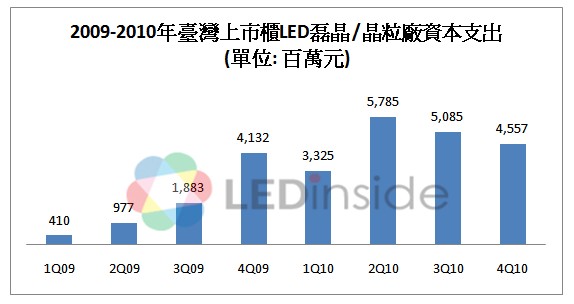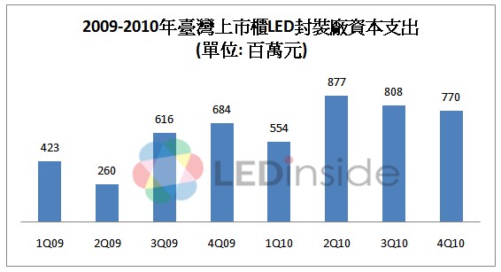 但若從2009年至2010年的資本支出,以季度區(qū)分上來(lái)看,不論是LED產(chǎn)業(yè)上游的芯片或是下游的封裝廠,在2010年第二季時(shí)皆大幅增加資本支出,以利新建廠房,購(gòu)置機(jī)臺(tái)設(shè)備。尤其是受到中國(guó)MOCVD機(jī)臺(tái)設(shè)備的補(bǔ)助誘因下,2010年芯片廠的資本支出總額高達(dá)187.5億元。而LED封裝廠也受惠于大陸半導(dǎo)體照明政策的推廣下,前往大陸主要半導(dǎo)體照明生產(chǎn)基地設(shè)立廠房,總計(jì)臺(tái)灣上市柜封裝廠的資本支出高達(dá)30.09 億元。