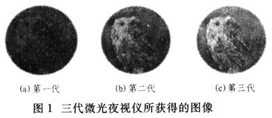 圖1所示是用三代微光夜視儀在同樣條件下分別獲取的圖像,從圖中可明顯看出第三代要優于第二代,而第二代又遠遠優于第一代。