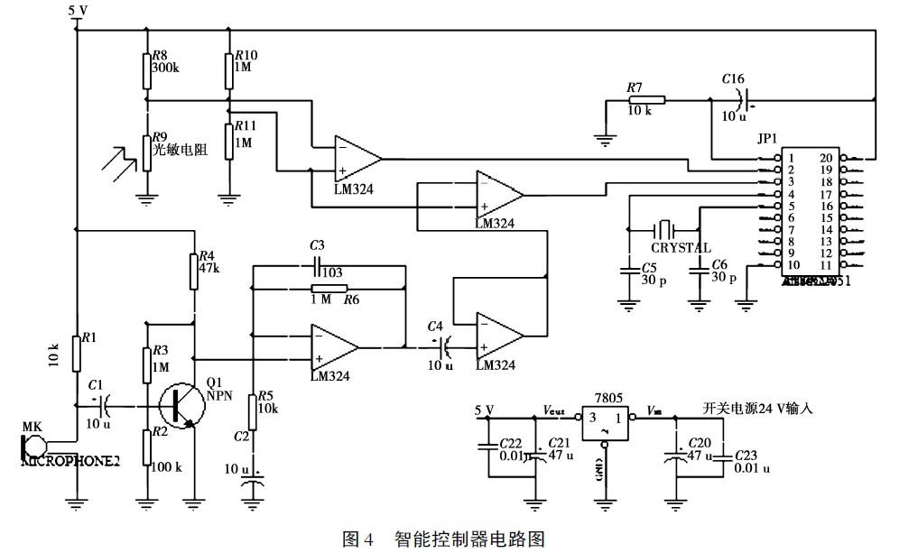 基于AT89C2051的智能控制器電路如圖4所示,其主要由傳感器單元、A/D轉(zhuǎn)換單元、控制器單元組成。AT89C2051芯片用于對來自聲控和光控傳感器檢測到的信號經(jīng)過整形以后的信號數(shù)據(jù)做處理,進(jìn)而控制LED驅(qū)動(dòng)器。該電路中AT89C2051的p3.0和p3.1端口用作輸入信號檢測,剩下的13個(gè)端口可選擇輸出控制。軟件流程圖如圖5所示。