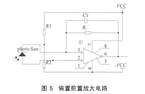 (1)由于運算放大器是雙電源器件,通過合理的選擇偏置電阻使光電轉換前置放大電路的輸出電壓達到合適的幅值(即設置適當的靜態工作點) , 以獲得最大的電壓擺幅, 避免飽和失真。 如圖 6 電路所示,電壓輸出設置于- 4 V 左右, 避免因強烈的環境光造成的飽和失真。